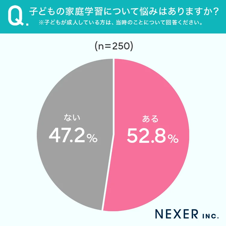 調査の結果、保護者の方の52.8%が「子どもの家庭学習に悩みがある」と回答しました。半数を超える多くの家庭にとって、子どもの学習サポートが負担となっている実態が明らかになりました。