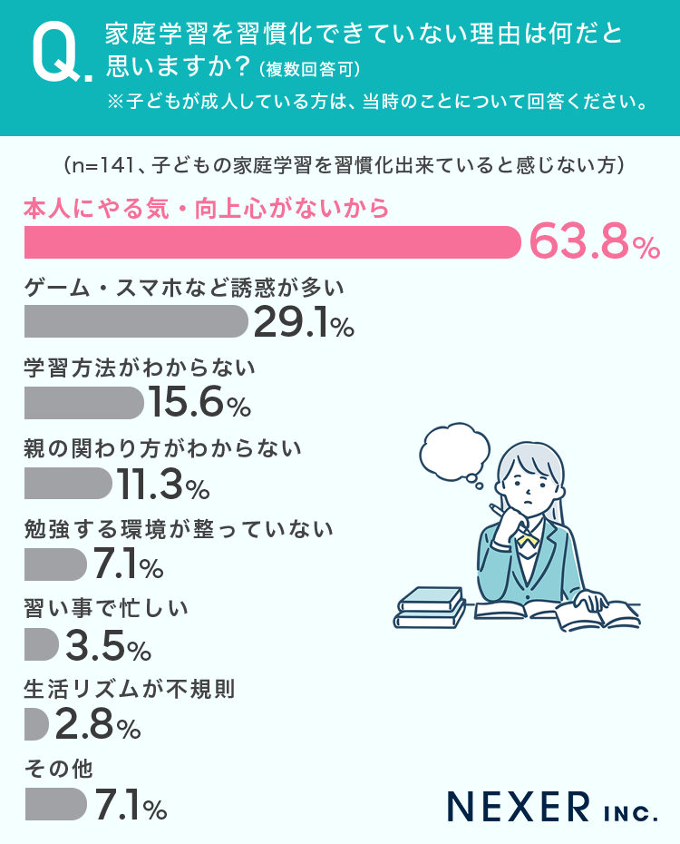 今回の調査では、保護者の方の半数以上が「子どもが自分から勉強しないこと」に悩んでいることが分かりました。また、家庭学習が習慣化しない理由として最も多かったのは「子どものやる気不足」であり、意欲をどう引き出すかが大きなテーマとなっています。